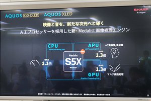 映像エンジンには、AIプロセッサーを採用した新開発の映像処理エンジンに「Medalist S5X」を搭載する。従来エンジンからCPU性能が約1.1倍、AI高画質/高音質に関連するAPU(AI Processing Unit)性能が約1.3倍、そしてマルチ画像処理能力に紐づくGPUが約1.3倍向上している。リアルタイムAI映像分析によって自動で画質調整を行うモードの「AIオート」や、視聴部屋の明るさや照明の色温度に最適化された調整を自動で施す「環境センシング」といった自動調整機能を備えている。