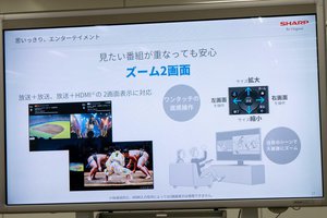 2番組同時表示の「ズーム2番組」も搭載。リモコンにある「2画面」ボタンを押すと、放送+放送/放送+HDMIの組み合わせによる映像の2番組表示が可能で、画面サイズの拡大/縮小と音を出力させる番組の選択もできる。画面サイズは大小9通り選べるとしている。