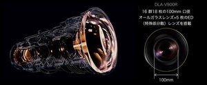 DLA-V900Rとの差異として、65mm口径15群17枚のオールガラスレンズを搭載。特殊低分散レンズは省略されており、シフト範囲も上下80%、左右34%のシフト範囲に留まる。外形寸法は500W×234H×505Dmm、質量は23.1kg。