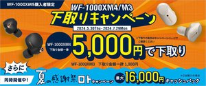 「2024年夏 1000Xシリーズ下取りキャンペーン」では、上記キャンペーン期間中に完全ワイヤレスイヤホン「WF-1000XM5」を購入した場合、旧モデル「WF-1000XM4」「WF-1000XM3」をそれぞれ所定の金額で下取りに出すことが可能。