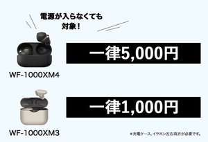 下取り金額は、WF-1000XM4が5,000円、WF-1000XM3が1,000円。イヤホン本体の左右、および充電ケースの3点がそろっており、破損がないことが下取り条件となるが、電源が入らないものについては下取り可能とのこと。