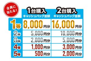 抽選は購入前に事前に実施する方式で、エントリーサイトからLINE登録/友だち認証を行うことで参加できる。8,000円/5,000円/2,000円/1,000円/500円のいずれか一つが必ず当選。また、2台同時購入として申し込むこともでき、その場合キャッシュバック金額は最大16,000円となる。