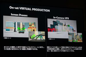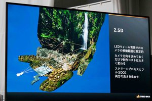 今回の説明会では、新たな撮影手法として「2.5D」と称した撮影のデモを実施した。実写ベースの2.5D空間を使用することで、フォトリアルな世界でIn-Camera VFXを組み込むことができるという。製作期間を比較的に短期間にすることができ、カメラワークを連動させられるため、3DCGよりもリアリティの高い映像制作が可能なことがメリットだとしている。
