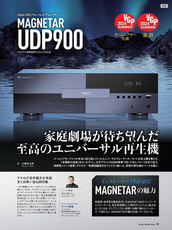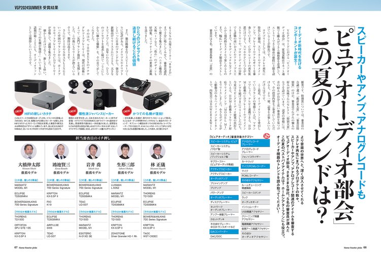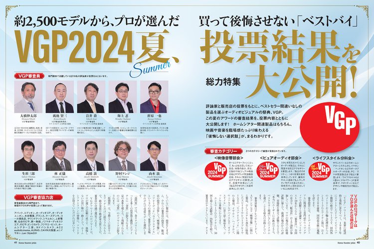 また、国内最大級のオーディオビジュアルの祭典「VGP(ブイジーピー)」の公式発表媒体として、2024夏のアワードの審査結果を完全収録しています。プロが実際に見て、聴いて、選んだ、オーディオビジュアル製品のベストバイがまるわかり! 誌面では、ここでしか読めない、評論家のみなさんの投票内容や、業界トレンド解説も掲載されています。