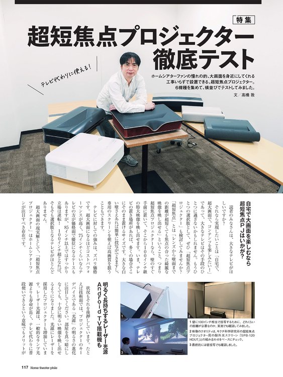 また、小特集として、工事いらずで大画面を実現できる、超短焦点プロジェクターの横並びテストも掲載。そのほか連載では、キャスター小倉智昭さんのコラム、Ultra HDブルーレイの画質・音質チェック、日本全国のホームシアターショップ情報なども掲載しています。