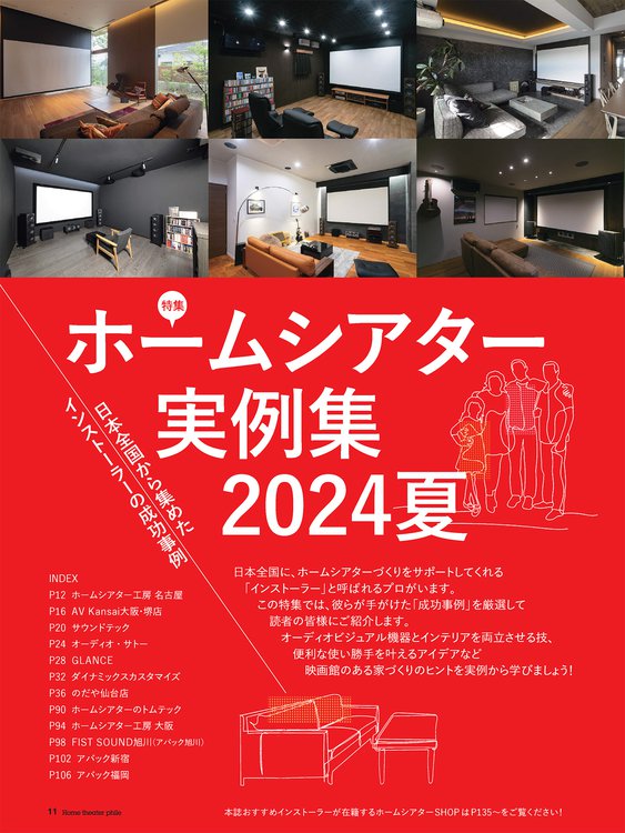 ホームシアターファイルは、映画館のある家をこれから作りたい人、いま楽しんでいる人のためのバイブル! 日本全国のホームシアターショップに在籍するプロフェッショナル、インストーラーが手がけた「ホームシアター成功事例」の数々を掲載しています。オーディオビジュアルの機能を、どのように住まいと美しく一体化させていくとよいのか、お役立ていただけるアイデアが満載です!