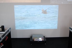 「テレビ番組も楽しめるテレビに代わる新しい映像機器にもなります。モバイルプロジェクターってどんなものなのか。どんな映像が見られるのか。モバイルプロジェクターコーナーでは、YouTubeや動画アプリも一部使えるようになっています。ぜひ、実際に見て、触って、ご体感ください」。