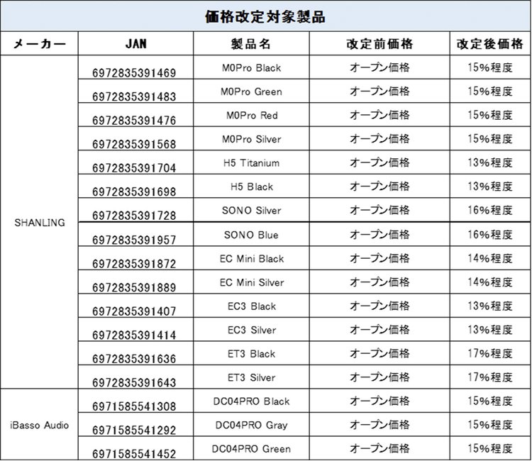 価格改定の対象となるのは、ShanlingのCDプレーヤー「EC Mini」「EC3」やDAP「M0Pro」、iBassoのポータブルDAC/アンプ「DC04PRO」など計7製品。改定後価格の一例として、Shanling「EC Mini」はおよそ14%程度の値上げ、iBasso「DC04PRO」はおよそ15%程度の値上げとなる。