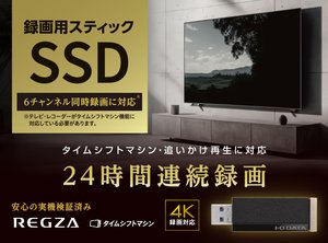 “レグザ” に搭載される「タイムシフトマシン」に対応した業界初(同社独自調べ/6月時点)の録画用スティックSSD。タイムシフトマシンとは、本体に接続した記憶媒体に録画予約なしで地デジ番組を最大6チャンネルまるごと予約できる全録機能。録画時間は利用している記録媒体の容量によって異なる。