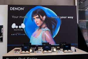 デノンからは音響パーソナライズ機能「Masimo AAT」を搭載した完全ワイヤレス「PerL Pro」「PerL」が登場。こちらもパートナーシップ締結が発表されたばかりの米歌手ケイティ・ペリーを起用した広告とともに、大々的に展開されていた。