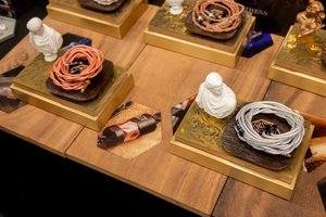 アユートのブースに隣接するELETECHのブースには、新たなリケーブル「ARISTOLE」と「EUCLID」が新製品として展示。前者は12 - 13万くらい、後者は15万円くらいで、来月発売するという。
