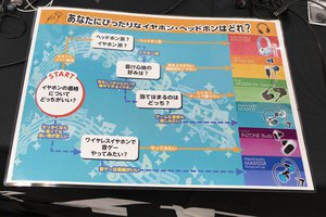 ゲームのユーザーが小学生から高校生の世代が多いことから、ラインナップの選出基準として、あまり高額なモデルではなくコスパの高いモデルを選出したとのこと。実際に6製品のうち、4製品がアンダー1万円となっている。ブースにはフローチャートも用意されており、好みをと照らせ合わせながら、自分に合うモデルを診断することができる。