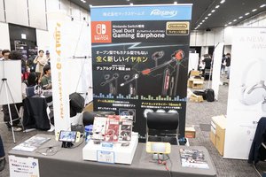 株式会社マックスゲームズは、このたび初めてポタフェスにブースを展開。6月28日に発売された「Nintendo SWITCH専用 デュアルダクトゲーミングイヤホン」の試聴体験コーナーを設置している。