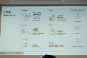 まずIFAとは、上述の通り家電・エレクトロニクスの展示会で、規模としては世界最大級となる。昨年は49か国から2285の企業が出展を行い、138の国から18万2000人が来場したほか、101の国から2647のメディアが取材。出展企業の47%がヨーロッパ圏以外であり、グローバルなイベントだと強調している。