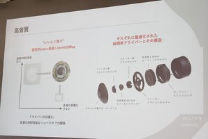 さらに音響的に最適になるよう、ドライバー部のグリル孔のパターンを低音と高音で変更。ドライバー自体を回転させ、耳の角度に合わせられるようにもなっている。再生周波数帯域は40Hz - 20kHz。