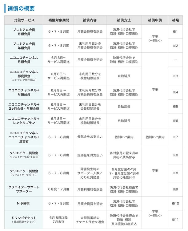 サービス停止に伴う補償対応についても詳細が決定。「ニコニコ」のプレミアム会員をはじめ、ニコニコチャンネル/ニコニコチャンネル+(プラス)、クリエイター奨励プログラム、N予備校、ドワンゴチケット利用者を対象に補償を行う。また、補償対象期間は、当初予定していた6月度・7月度から8月度まで延長する。