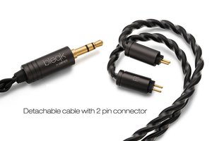 専用の着脱式ケーブルを付属し、接続端子は3.5mmステレオミニ、コネクターは2pin。ほか付属品としてキャリーケースや、ブレットシェイプシリコンイヤーチップとボウルシェイプイヤーチップを3サイズ(S/M/L)各1ペアずつ同梱する。