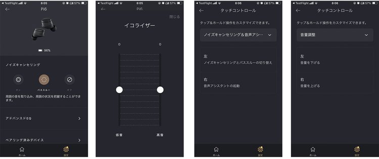 専用アプリには、「高音」と「低音」の2バンドイコライザーを搭載しており、ユーザーの好みに合わせて調整可能。また、タッチコントロールの切り替えも行うことができ、ノイズキャンセリングと音声アシスト起動、音量調整の左右割り振りを変更することもできる。