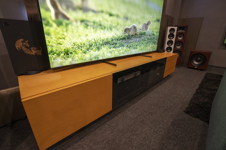 3枚のスクリーンの奥には、ソニーの4K有機ELテレビ・BRAVIA(83V型)が壁掛けで設置される2WAY仕様。スピーカーもメインスピーカー、センタースピーカー、ウーファーをJBL“Studioシリーズ”に一新した。