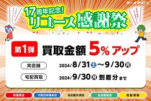 上記期間中に同店の買取サービスを利用すると、最終査定金額よりさらに5%金額がアップされる。対象店舗はe☆イヤホン秋葉原店、大阪日本橋本店、名古屋大須店、仙台駅前店、および宅配買取で、宅配買取の場合は9月30日到着分までが適用対象となる。