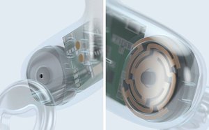 ドライバーユニットは、世界初の骨伝導イヤホンマイクや骨伝導携帯電話の開発などで知られるテムコジャパンが手掛ける、14mm「ダイナミック型ハイブリッド骨伝導ドライバー」を搭載する。中低音域をリングパーツから骨を通じて伝達するだけでなく、音の質感を決定づける高音域を空気振動によって伝達するハイブリッド方式を採用。