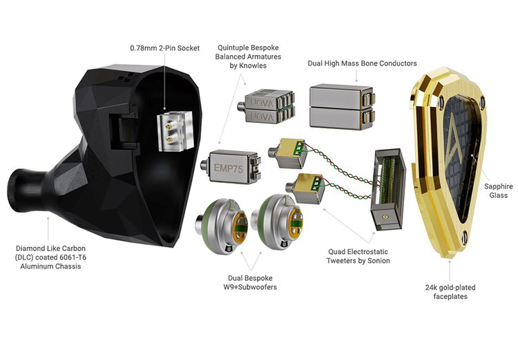 ドライバー構成は、Sonion製骨伝導ドライバーを2基、Empire Ears独自のダイナミックドライバー「WEAPON 9+」を2基、Knowles製BAドライバーを4基、Sonion製BAドライバーを1基、Sonion製静電トゥイーター(EST)を4基、計13基を搭載。空気伝導と骨伝導を組み合わせて音を伝える「デュアル・コンダクション・アーキテクチャー」により、優れた定位と音場、ディテール、深く沈み込む低域、豊かな響きなどを兼ね備えたとする。