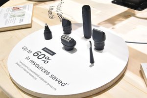 生産面だけでなく、流通する製品においても素材使用を最小限に抑え、リサイクル素材や再生可能素材を利用した「循環型製品」の開発を促進する。一例として欧州で展開しているアタッチメントシステム「マルチシェード」を採用したボディートリマーを紹介。身体の部位に応じたアタッチメントを多く展開することで、1つのメイン機器で様々な機能に対応させたモデルだ。このように一つの製品のカバー範囲を拡げ、製品の買い替えを抑制することで、資源効率を高めたと説明する。