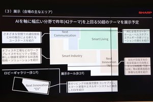 シャープが目指すAIの社会実装の方向性とエッジAI技術「CE-LLM」をはじめとするAI要素技術の応用を紹介する「Next Innovation “AI”」、AIによるスマートホーム/ヘススケア/エネルギーの各ソリューションの進化を見せる「Smart Living」といったカテゴリーも用意。さまざまな空間での通信技術とAIの融合による新たなユースケースが並ぶ「Next Communication」、オフィスや工場などワークプレイスやモビリティ空間にAI技術を活用したソリューションを展示した「Smart Industry」も展開し、これらは展示ホールで体感できる。