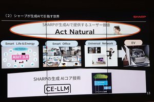 シャープは生成AIで提供するユーザー価値に対して「Act Natural」と銘打つ。従来までの機器は「人が機械に合わせる」もので、機器のボタン操作や画面のタッチ操作など、ユーザーが機器を使用するためにしなければならない部分が多かったが、未来は機器のボタンやタッチ操作が簡易的で、さらにハンズフリーやAIで解決する「使いこなしのために人間が合わせなくて良い」ということをコンセプトとしているとのこと。