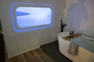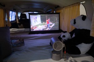 ブースではMogo 3 Proのスタンド一体型という特徴を活かし、寝室やバスルームといった環境のなかで、どのように製品を楽しめるかを紹介。また、自動車内に設置したスクリーンに投写した様子を展示するなど、自宅以外でのユースケースも案内している。