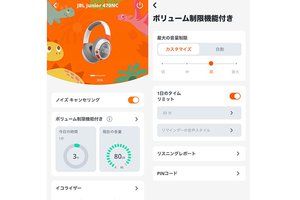 本体のカラーバリエーションは全3色を用意。専用アプリ「JBL Headphones」と連携することで、保護者の方が使用時間や音量等のモニタリング管理が行える。