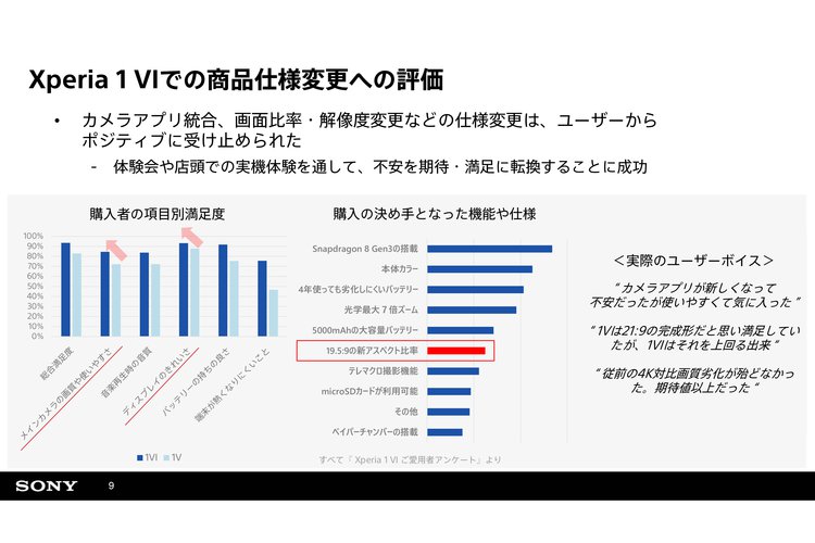 また、Xperia 1 VIで大きな変更点であった「カメラアプリの統合」「画面比率・解像度変更」といった仕様は、当初ネガティブなイメージを持たれるのではないかと懸念があったが、ユーザーからはポジティブに受け止められているとのこと。