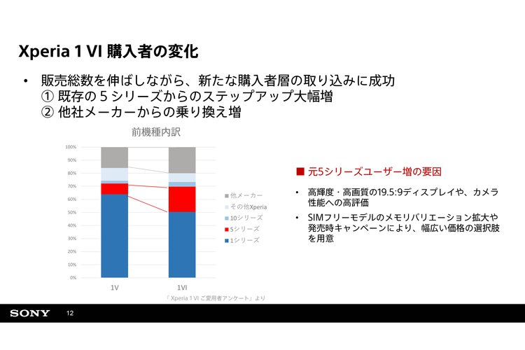 Xperia 1 VIの購入者を調査したところ、ハイエンドモデルの購入者に従来とは異なる変化が起きているという。特に“Xperia 5シリーズ”からのステップアップが大幅に増加していること、そして他社メーカーからの乗り換えが増えていることが、大きな変化であると伝えた。