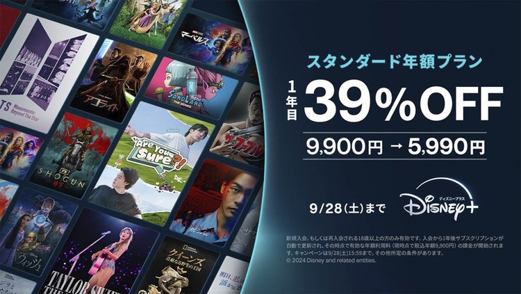 9月12日(木)16:00から28日(土)15:59までの期間中に、ディズニープラスへ新規加入したユーザーを対象に、通常9,900円の「スタンダード年額プラン」を、初年度39%オフの特別料金5,990円で提供するというもの。この価格は月額プランの通常価格に換算すると、約6ヶ月分の利用契約料金に相当し、お得にディズニープラスをはじめることができると説明している。