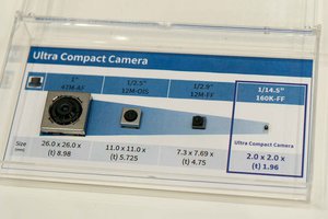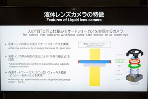 カメラ技術の進化として、高速かつ広いオートフォーカスと手振れ補正に対応した液体レンズ、視線追跡や手動追跡を実現する世界最薄1.96mmのカメラモジュールなどが並んでいた。人間の目と同じ仕組みを実現するものから、超小型にも関わらず高い光学性能を実現したデバイスが紹介されている。