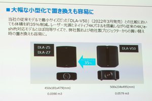 2022年に発売された同社の最小サイズモデル「DLA-V50」と比較して約35%の体積を削減。また2017年にリリースされた4Kプロジェクター「DLA-X990R」とほぼ同等サイズであり、他社のネイティブ4Kプロジェクターと比較してもサイズがコンパクトなため、安心して置き換えらえることもメリットだとアピールしている。