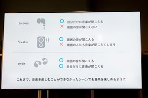 それを踏まえ、イヤホンを使うと周囲の音が聴こえない、スピーカーを使うと周囲の音も聞こえるが、周りの人にも音楽が聴こえてしまうといった「制限や制約」を払拭するものとして、同社のデバイスを展開。「日常生活に好きなBGMをつけて、自分の人生自体をコンテンツとして楽しむことを実現できる」といった強みを紹介。また、プロダクトとして音楽ではなく、日常生活を中心に据えていることこそ、他のオーディオメーカーとは大きく異なる点だと力を込めた。