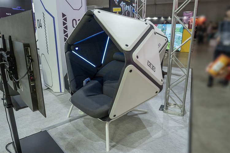 XEO LABブースでは、多面体形状のチェアの内部に20基のスピーカーを内蔵するチェア型のスピーカーシステム「XEO POD」を展示。9.2.4chの立体音響の再生に対応し、ユーザーは座るだけで没入感のあるサウンド体験できる。