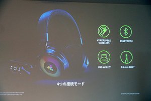 さらに接続面では、Kraken V4と同様の独自のワイヤレス伝送技術「Razer HyperSpeed Wireless」による2.4GHz低遅延接続、Bluetooth接続、USBによる有線接続に加えて、新たに3.5mm AUX接続による、Razer初の計4種類接続モードに対応する。また、USBコントロールハブを使用することで、PCやコンソール機など様々なプラットフォームに対応するほか、2.4GHzとBluetoothオーディオの同時接続にも対応し、ゲームをしながら通話チャットを行うことができる。
