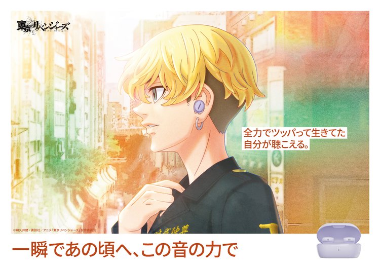 コラボビジュアルはQC Earbudsを装着した花垣武道、佐野万次郎、松野千冬の3パターンを用意。「一瞬であの頃へ、この音の力で」というメッセージを込めて描き下ろされたもので、いまを生きる3人が中学生だった2005年によく聴いた思い入れのある楽曲をQC Earbudsで聴き、当時に想いを馳せる様子を描写。それにリンクして、3人の容姿はもちろん、背景の渋谷の風景も2005年に巻き戻っているという。