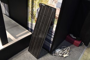 CEATECにて出展されたA0サイズは、上記A2サイズ4枚を1枚のガラスに貼り付けることで大型化。ソーラーパネルと蓄電池を搭載し、表示の書き換え時に発生する電力を太陽光で発電・蓄電した電気のみで補うことができ、電源設備の無い場所での利用も可能になっている。