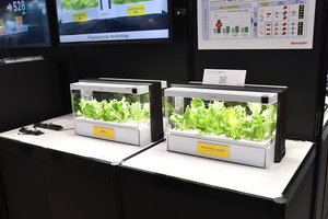 SHARPブースではほかにも、プラズマクラスターの送風によるレタスの葉のサイズと重量増加、イネの成長促進を例にした「プラズマクラスター技術による植物生育促進」デモ、同社電卓販売60周年を記念する展示など多岐にわたる内容が並んでいる。