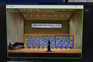 2Kで切り出す領域については、AIを用いて自動で切り出し範囲を設定することも可能。合唱コンクールの映像を用いたデモンストレーションでは、壇上に上がる歌唱者の顔をリアルタイムで検出し、広角撮影の全体部と切り出しを行った上手/中央/下手の3エリアの領域情報を取得していた。