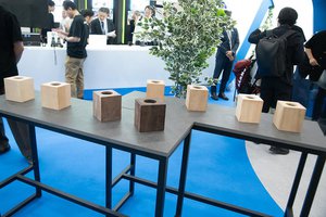 また、ブースでは五感に訴えかけるデバイスとして外枠に天然木を採用した、ワイヤレススピーカーを8基展示。いずれも使用ユニット、形状も同一のものだが、それぞれ異なる木材を使用する。この展示では、「音と香りによる感覚拡張」を狙いとしており、木の香りと肌触りを感じながら音楽を楽しむといった体験価値の向上をコンセプトとしている。