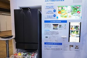 そしてAIの社会実装事例の展示として、同社のAIカメラ搭載冷凍冷蔵庫を紹介する。AIテクノロジーを活用した野菜自動認識機能により、庫内の在庫管理や、先に消費した方が良い野菜とそれを用いたレシピを提案するデモンストレーションを実施している。