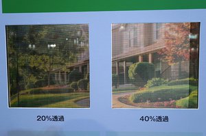ブース内には、建材として実用サイズである1m×1.8mサイズのガラス面に発電層を形成した建材一体型太陽電池を今回初展示する。サイズや透過性、グラフィックパータンなどは自由にカスタマイズが可能。建築基準に適合した強度・厚みを備えることでガラス建材として使用でき、透過率は1枚のガラスの中でも自由に変更できるとのこと。