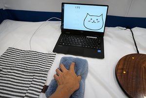担当者によれば、金属以外の絶縁体であれば、ほぼどの素材にも対応するとのこと。木材であれば約10cmほどの厚さでも検知が可能で、活用例として観葉植物の下にタッチパネルを敷くことで、観葉植物の葉に触れると、触れた場所に応じて事前に設定しておいた音声が再生されるデモ展示も行っていた。