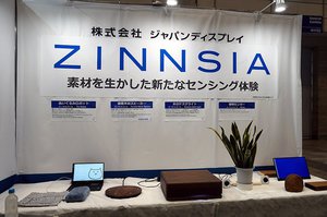ジャパンディスプレイのブースでは、様々な素材の表面をタッチパネルへと変貌させる独自のセンサー技術「ZINNSIA(ジンシア)」を紹介。本技術を用いた様々な活用例のデモンストレーションを用意し、「素材を生かした新たなセンシング体験」が体感できると謳っている。
