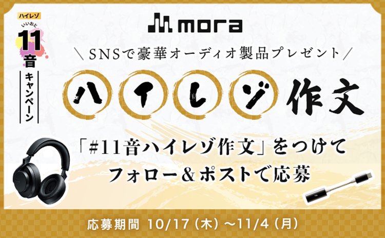 音楽ダウンロードサービスmoraは、ハイレゾ音源配信開始11周年を記念した「mora ハイレゾ11音(いいおと)キャンペーン」の第2弾として、ハイレゾにまつわる短文をSNSで投稿/応募すると抽選でオーディオ製品をプレゼントする企画「ハイレゾの魅力を伝えよう!ハイレゾ作文」を実施する。応募期間は本日10月17日(木)から11月4日(月) 23時59分まで。