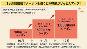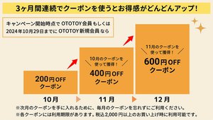 OTOTOY会員に対しては、2,000円以上の楽曲購入で利用できる「ステップアップ・クーポン」を配布。10月、11月、12月と月ごとに割引クーポンを配布し、毎月のクーポンを利用することで翌月分のクーポンを受け取ることができる仕組みとなっている。クーポン配布対象は、10月29日までに登録したすべてのOTOTOY会員で、9月29日までに有料のOTOTOY PREMIUM/OTOTOY SUPER PREMIUM会員に登録したユーザーには割引額の大きなクーポンがプレゼントされる。
